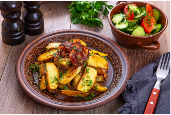 Шаг 7: Подавайте картофель с беконом на тарелках, красиво расположив рядом овощной салат.