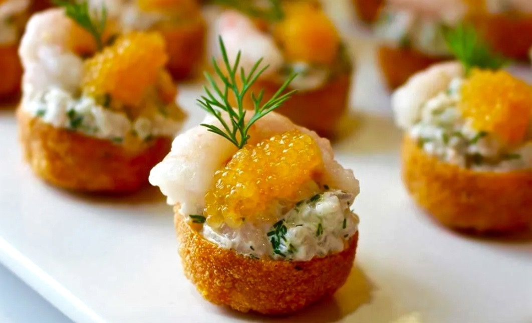 - Крутоны с креветками и греческим салатом. Хрустящие крутоны, свежий салат и сочные креветки — это простое и элегантное решение для закуски, которое украсит любой стол.