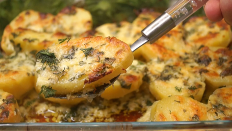 3. После того как картофель будет готов, его аккуратно помещают в заранее смазанную маслом форму для запекания, а затем обильно покрывают приготовленной чесночно-масляной заливкой.